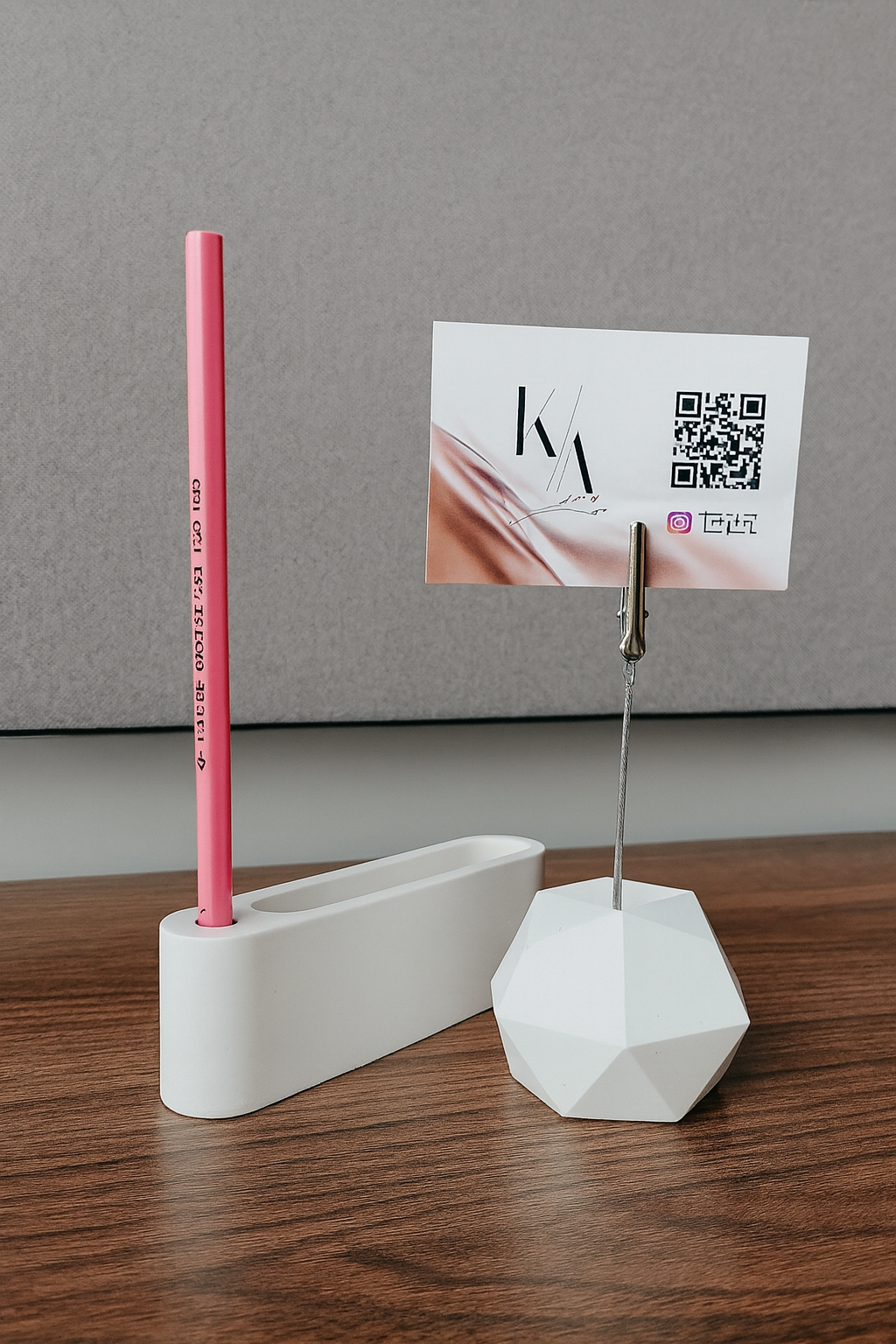 El yapımı minimalist beton ofis seti; kalemlik ve kartvizitlik bölümleriyle masanızı şık ve düzenli tutar. Dayanıklı yapısı, modern tasarımıyla ofisinizin dekoruna estetik bir dokunuş katar.